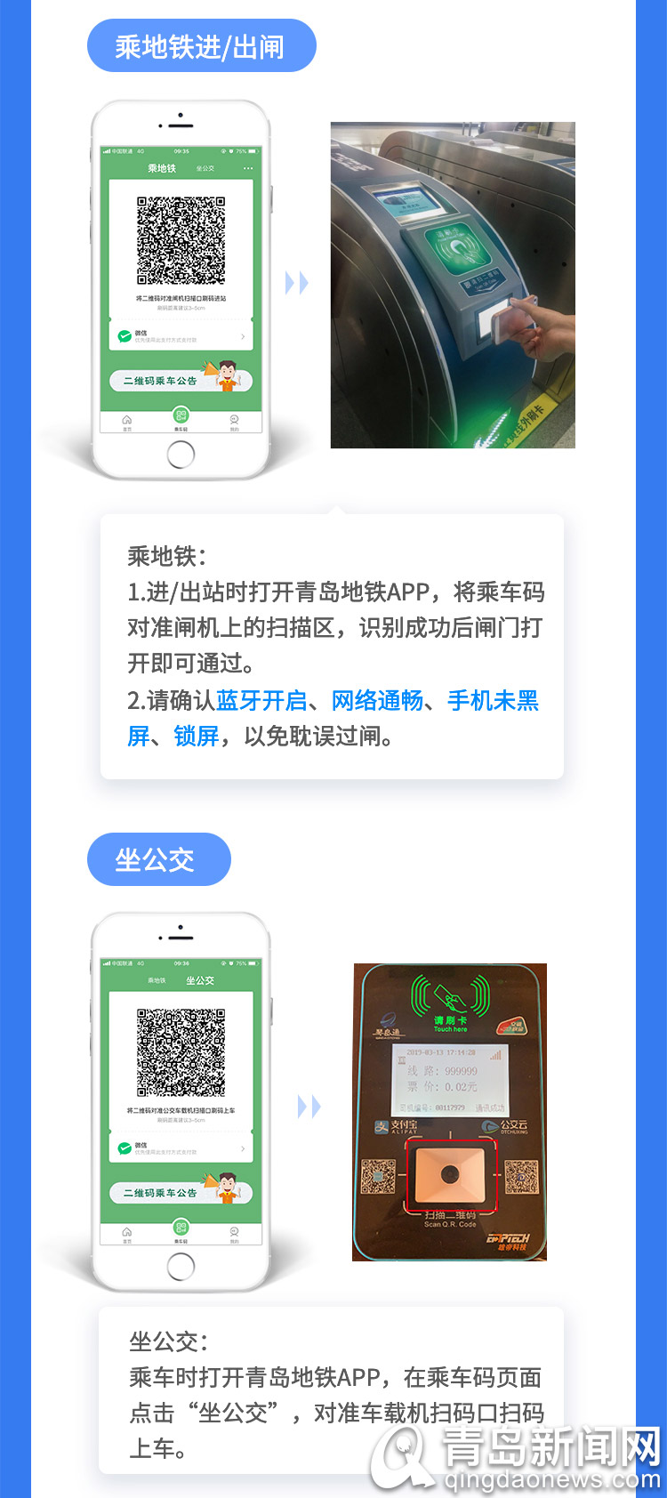 (2)使用時(shí)須確保綁定的支付方式賬戶內(nèi)有足夠的余額支付車費(fèi),或賬戶綁定了信用卡、儲(chǔ)蓄卡可自動(dòng)扣費(fèi);(3)上車前均須提前打開(kāi)青島地鐵APP,點(diǎn)擊【乘車碼】,并切換到“坐公交”,無(wú)需打開(kāi)手機(jī)藍(lán)牙;