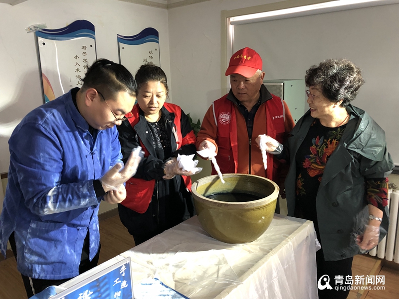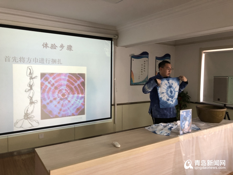 青島原一藝術扎染工作室創(chuàng)始人孫珺琦,從扎染的歷史、原理、在現(xiàn)代服裝中的運用,以及草木染的原理、中外運用對比等方面,為現(xiàn)場居民進行了詳細講解,并現(xiàn)場指導居民制作扎染手帕。孫珺琦曾在中國扎染之鄉(xiāng)大理周城村系統(tǒng)學習古法扎染,并先后向多位扎染專家學習,如今,他一直致力于在青島宣傳和推廣這門傳承了上千年的有著濃重歷史文化和魅力的手藝。