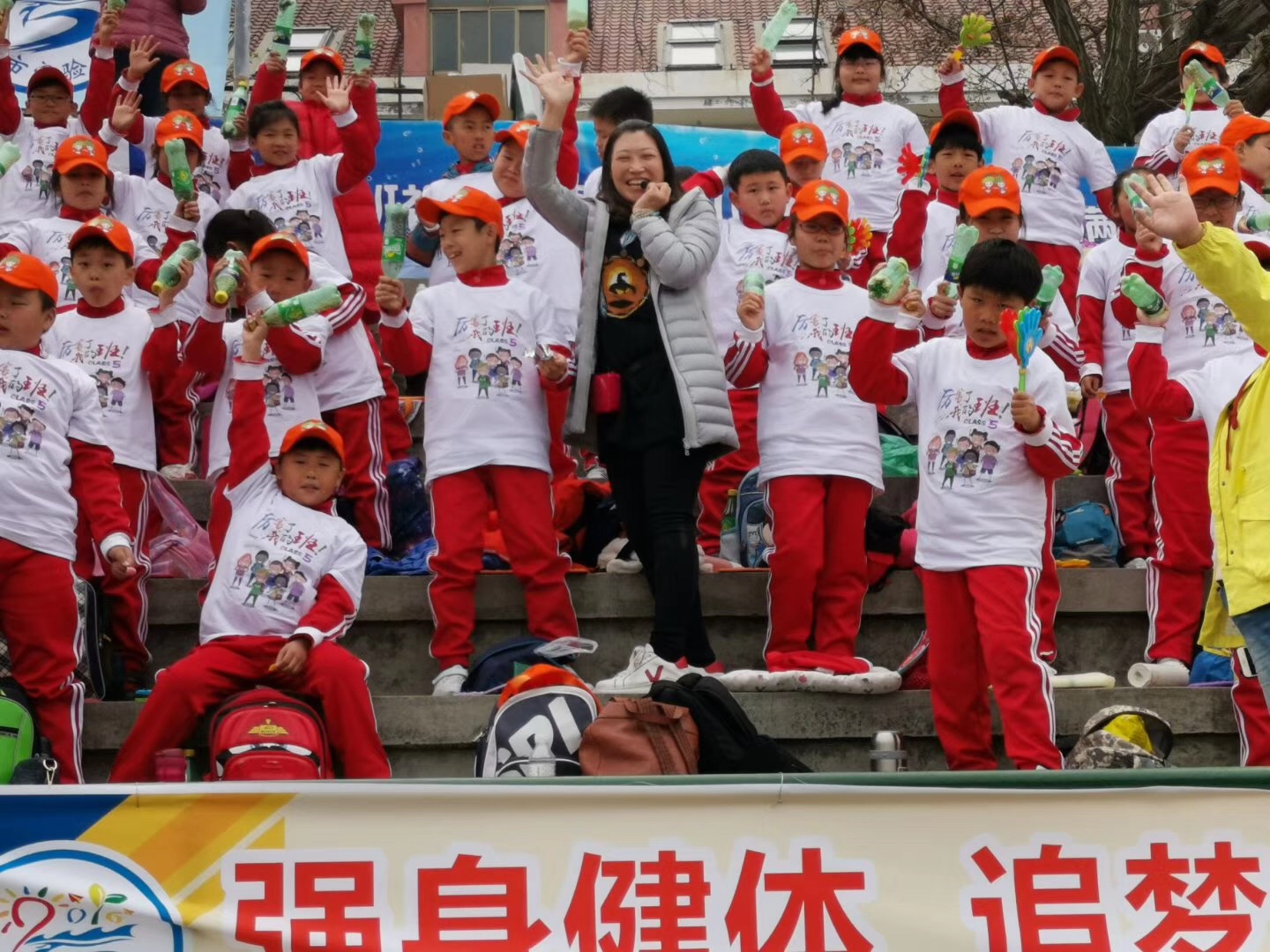 賽場上既緊張又刺激,看臺上也熱鬧的很!班級自發(fā)組織的啦啦隊(duì),為運(yùn)動健兒們搖旗吶喊!