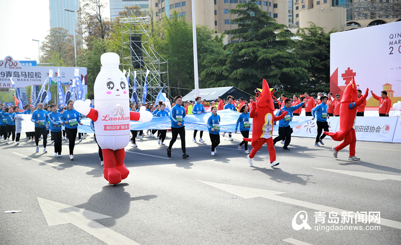 起點處,一排超大“嶗山礦泉水瓶”與跑者熱情互動。