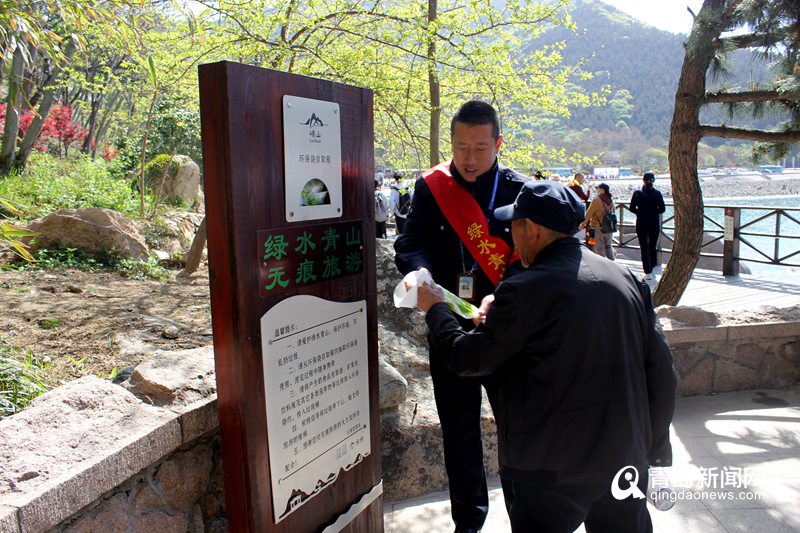 文明、和諧的旅游環(huán)境是每位游客都希望和向往的,嶗山景區(qū)正在積極倡導(dǎo)開展“‘綠水青山無痕旅游’活動,引導(dǎo)游客樹立文明旅游新風(fēng)尚?!本皡^(qū)處處可以看到文明旅游公示牌,全域旅游宣傳片和文明標(biāo)語,各游覽區(qū)還增設(shè)了景觀式分類垃圾集中回收點(diǎn),并安排志愿者向游客發(fā)放環(huán)保垃圾袋。
