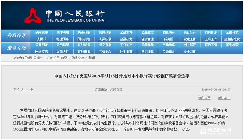 青島新聞網(wǎng)5月6日訊(記者 劉倩倩)結(jié)構(gòu)性降準要來了!記者從央行網(wǎng)站獲悉,為貫徹落實國務(wù)院常務(wù)會議要求,建立對中小銀行實行較低存款準備金率的政策框架,促進降低小微企業(yè)融資成本,中國人民銀行決定從2019年5月15日開始,對聚焦當(dāng)?shù)?、服?wù)縣域的中小銀行,實行較低的優(yōu)惠存款準備金率。對僅在本縣級行政區(qū)域內(nèi)經(jīng)營,或在其他縣級行政區(qū)域設(shè)有分支機構(gòu)但資產(chǎn)規(guī)模小于100億元的農(nóng)村商業(yè)銀行,執(zhí)行與農(nóng)村信用社相同檔次的存款準備金率,該檔次目前為8%。約有1000家縣域農(nóng)商行可以享受該項優(yōu)惠政策,釋放長期資金約2800億元,全部用于發(fā)放民營和小微企業(yè)貸款。