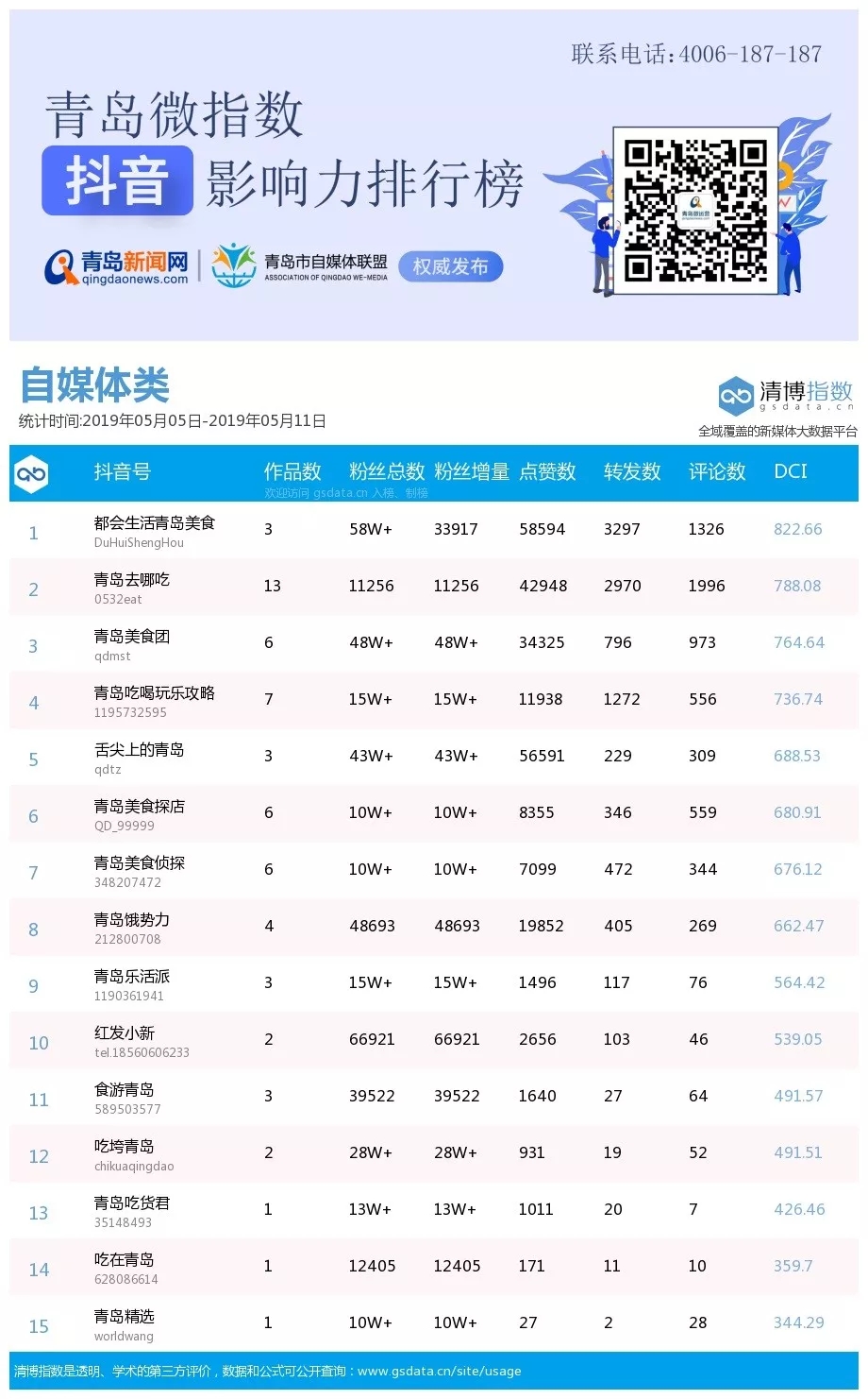 青島微指數(shù)抖音影響力排行榜第1期(5月5日-5月11日)自媒體類抖音號(hào)排行榜,今天重磅出爐!