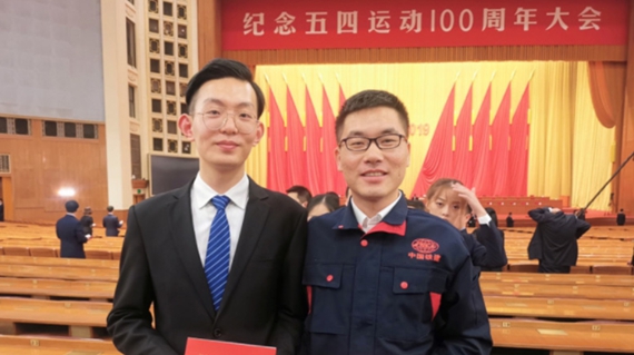 2019年“全國向上向善好青年”稱號獲得者、電氣工程學(xué)院2017級碩士研究生李林威(左)在紀(jì)念大會現(xiàn)場 重慶大學(xué)供圖 華龍網(wǎng)發(fā)