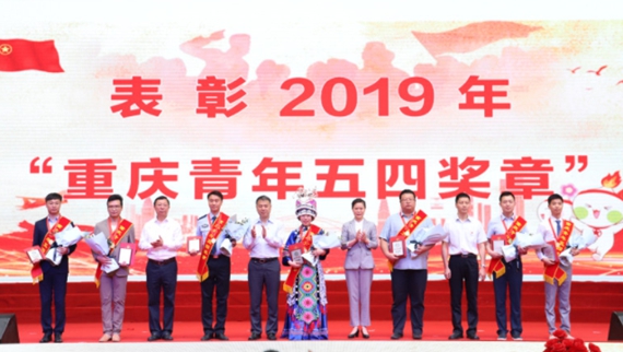 2019年“重慶青年五四獎?wù)隆鲍@得者、自動化學(xué)院教授蘇曉杰(右四)在重慶五四表彰現(xiàn)場領(lǐng)獎 重慶大學(xué)供圖 華龍網(wǎng)發(fā)