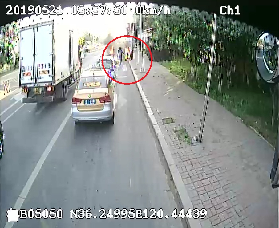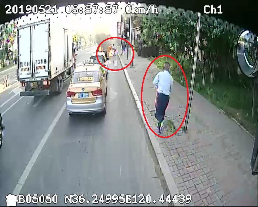 據車載監(jiān)控顯示,21日早5點50分,城陽巴士第六分公司的906路駕駛員韓明炫駕車行駛至玉霞路和王沙路口時,忽然看到前方濃煙滾滾,路口有一輛摩托車側翻并發(fā)生自燃。就在這時,一個“火人”從濃煙中沖出,滿地翻滾,狀態(tài)異常痛苦,有兩個好心市民試圖用衣物幫他將身上的火撲滅,可是由于火勢太大,沒有起到絲毫的左右。