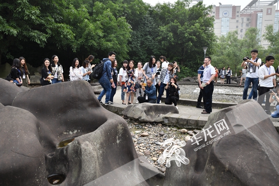 在校園參觀環(huán)節(jié),世外桃源般的校園風(fēng)景讓記者們流連忘返,其中,占地100畝的大江風(fēng)骨景觀,讓記者們眼前一亮,大大小小的長(zhǎng)江石形態(tài)各異,錯(cuò)落有致,甚至石頭上被江水沖擊的痕跡,和當(dāng)年纖繩留下的凹痕,還清晰可見(jiàn)。