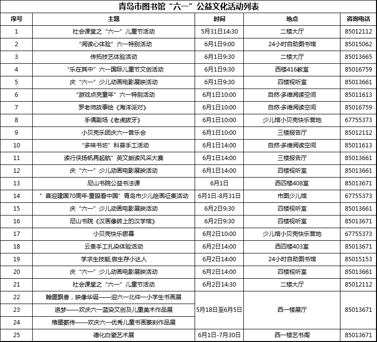 “六一”期間,各區(qū)市公共圖書館同樣為小朋友們準(zhǔn)備了精彩紛呈的公益文化活動:城陽區(qū)圖書館將啟動“青草灣讀書會”城陽活動基地,并舉辦“閱讀的力量”專題講座;即墨區(qū)圖書館將面向全區(qū)中小學(xué)開展紅色主題系列讀書活動和“我的祖國我的家”主題征文活動等;膠州市圖書館將舉辦“慶六一·兒童百米長卷書畫”等活動;萊西市圖書館將組織“讀繪本”系列公益閱讀故事會以及講故事比賽等活動;嶗山區(qū)圖書館將推出人工智能親子活動、國學(xué)課堂進(jìn)校園等活動;李滄區(qū)圖書館將開展面向少年兒童的兒童詩征集活動、七彩星書友會以及“初夏?茶香?問道”茶藝等活動;平度市圖書館將舉辦“科普平度青少年e站”系列活動、“百年大計愛育未來”系列讀書活動等;市北區(qū)第二圖書展將推出“童筑中國夢”慶六一少兒美術(shù)作品展;市南區(qū)圖書館將推出“享讀沙龍”閱讀互動活動以及“我心中的圖書館”兒童畫展覽等活動;西海岸新區(qū)圖書館則推出了少兒作文公益指導(dǎo)講座、國學(xué)吟誦課以及繪本閱讀和手工制作等活動。