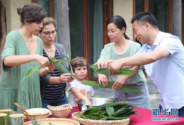 6月2日,在浙江省湖州市德清縣莫干山鎮(zhèn)仙潭村一家民宿內(nèi),來(lái)自西班牙的游客在體驗(yàn)包粽子。新華社發(fā)(王正攝)