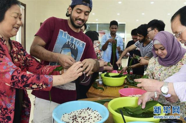 6月2日,在江蘇省鎮(zhèn)江市金江社區(qū),來(lái)自江蘇大學(xué)的留學(xué)生在體驗(yàn)包粽子。新華社發(fā)(石玉成攝)