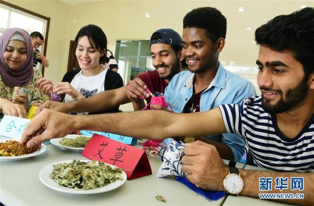 6月2日,在江蘇省鎮(zhèn)江市金江社區(qū),來(lái)自江蘇大學(xué)的留學(xué)生在體驗(yàn)制作香囊。新華社發(fā)(石玉成攝)