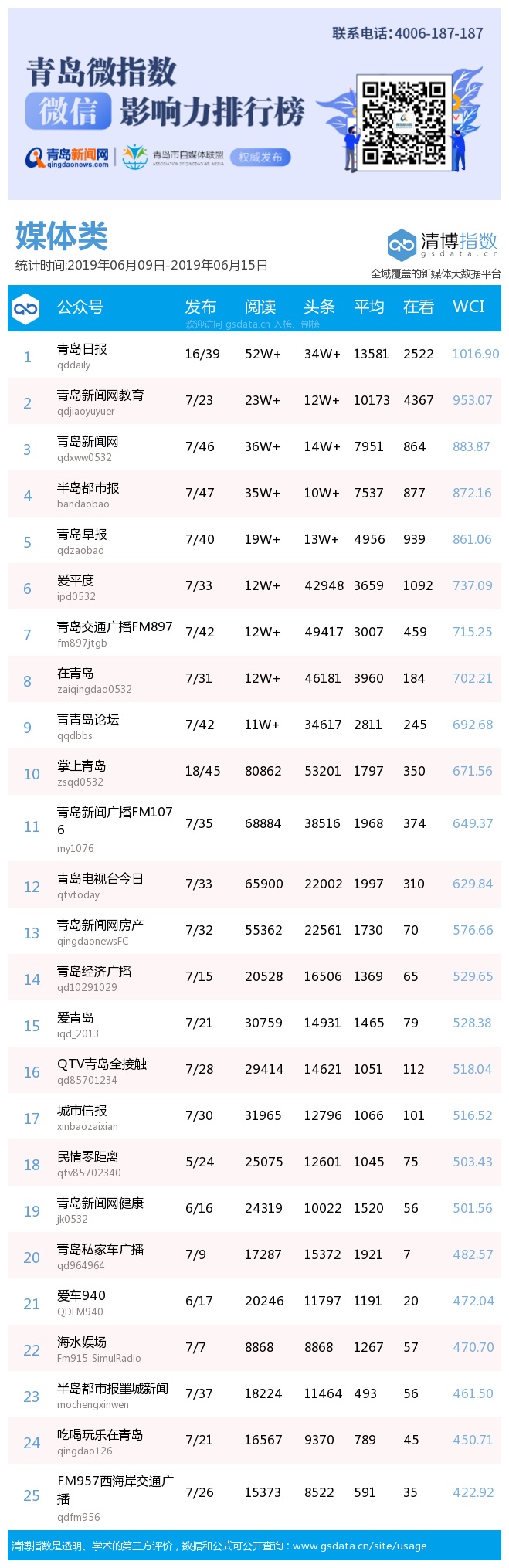 青島新聞網(wǎng)6月17日訊(記者 邢書玲)由青島新聞網(wǎng)、清博指數(shù)平臺聯(lián)手打造的“青島微指數(shù)微信影響力排行榜”今日發(fā)布一周(6月9日-6月15日)榜單。