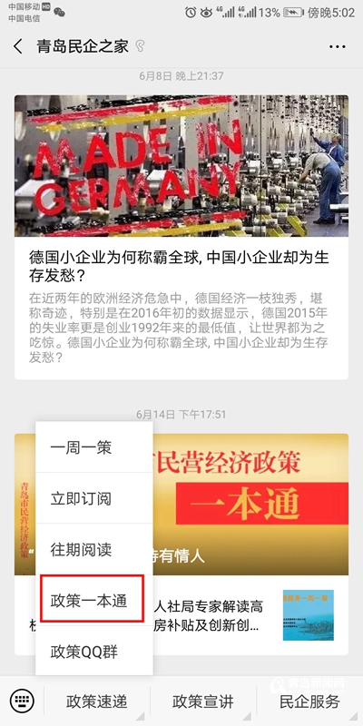 工作人員告訴記者,為實現(xiàn)“讓信息多跑路、讓企業(yè)少跑腿”,“一本通”電子書于今天正式上線啟用,企業(yè)可通過關(guān)注“青島民企之家”微信公眾號獲取,具體操作如下:關(guān)注微信公眾號,點擊下拉菜單第一項“政策速遞”,選擇“政策一本通”即可在線查閱、瀏覽。