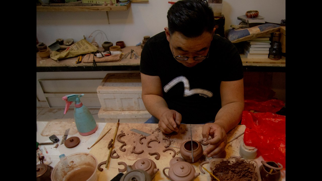 修坯結(jié)束后,李老師又拿著修好的壺身坐到了工作桌前,反復(fù)比量之后,確定了壺嘴和壺柄的位置,并做出大小形狀合適的壺柄。如果幸運(yùn)的話,桌上散落著壺柄可能會(huì)有一個(gè)符合他的選擇。