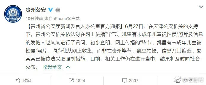 @貴州公安最新發(fā)布消息稱,6月27日,在天津公安機(jī)關(guān)的支持下,貴州公安機(jī)關(guān)依法對(duì)在網(wǎng)上傳播“畢節(jié)、凱里有未成年兒童被性侵”照片及信息的發(fā)帖人趙某某進(jìn)行了訊問。初步查明,網(wǎng)上傳播的“畢節(jié)、凱里有未成年兒童被性侵”照片,均為他從網(wǎng)上收集,而非在貴州畢節(jié)、凱里拍攝,信息系其編造。趙某某已被依法采取強(qiáng)制措施。
