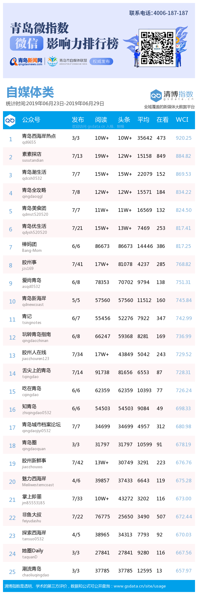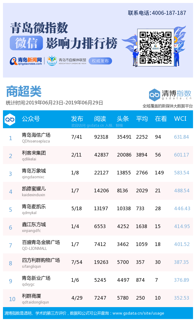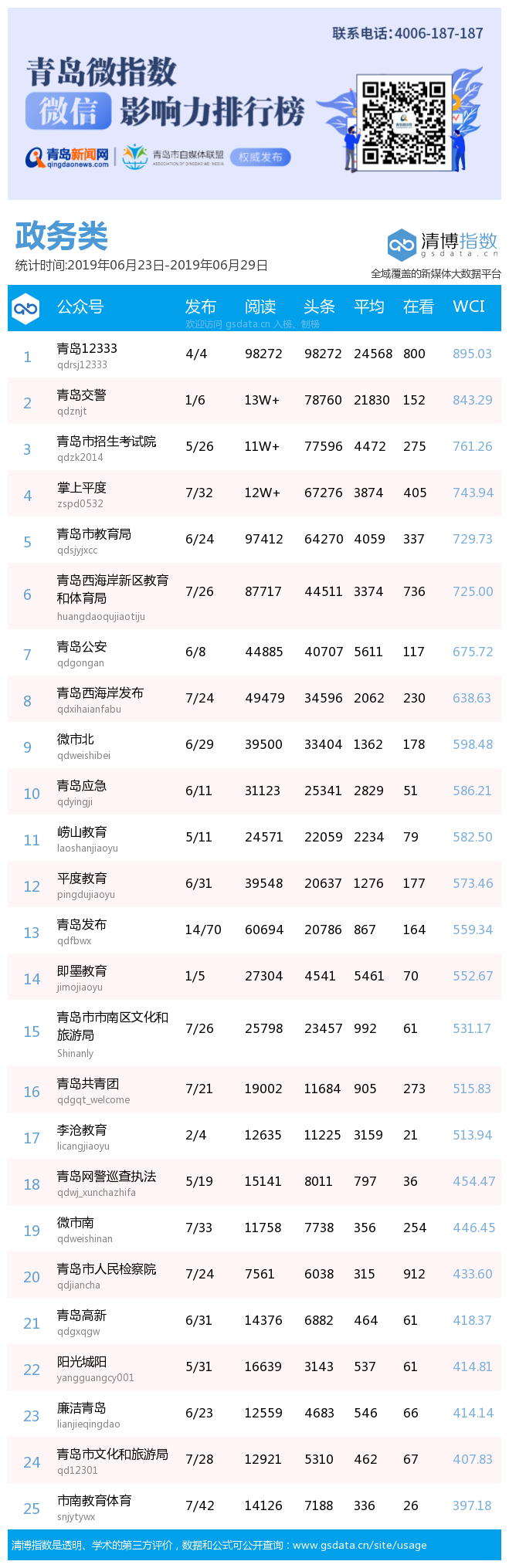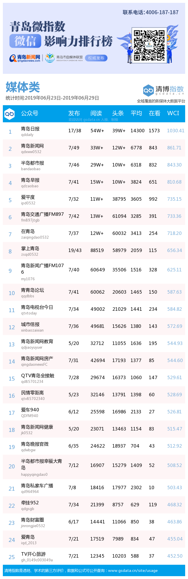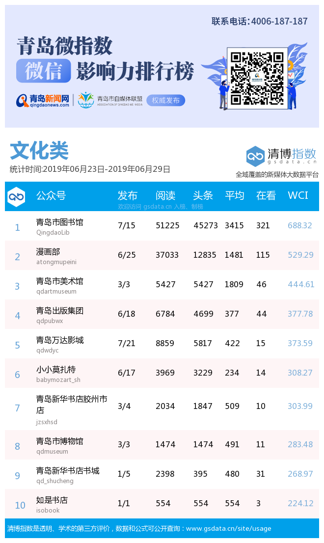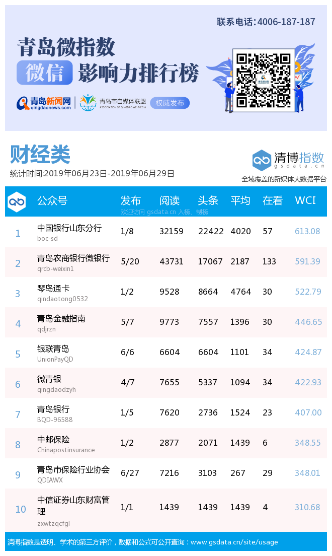 青島新聞網(wǎng)7月2日訊(記者 邢書玲)由青島新聞網(wǎng)、清博指數(shù)平臺聯(lián)手打造的“青島微指數(shù)微信影響力排行榜”今日發(fā)布一周(6月23日-6月29日)榜單。