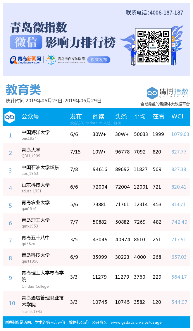 政務(wù)類榜單中,“青島市招生考試院”由上期第13名直升至本期第3名;“嶗山教育”連升13個名次,成本期進步最快官微;熱文榜中,“青島市招生考試院”發(fā)布的“高考志愿填報咨詢平臺(面向山東)開通上線”一文,受到廣大考生關(guān)注,以閱讀36274次,在看數(shù)108的成績奪得熱文榜第3名。