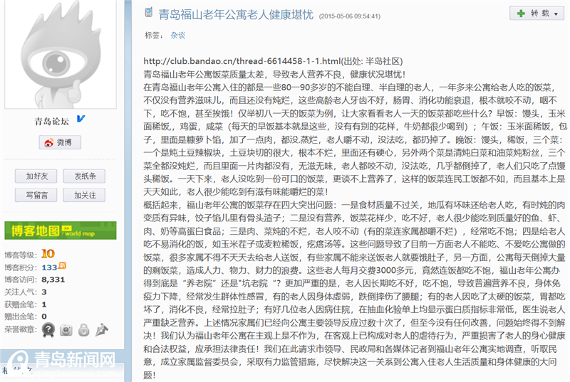 記者聯(lián)系了發(fā)帖人,他表示并不是自家老人在福山養(yǎng)老院,帖子是從微博轉(zhuǎn)載的。記者到網(wǎng)上搜索發(fā)現(xiàn),2015年5月6日,ID為【青島論壇】的用戶發(fā)表過(guò)一篇內(nèi)容大體一致的博文。