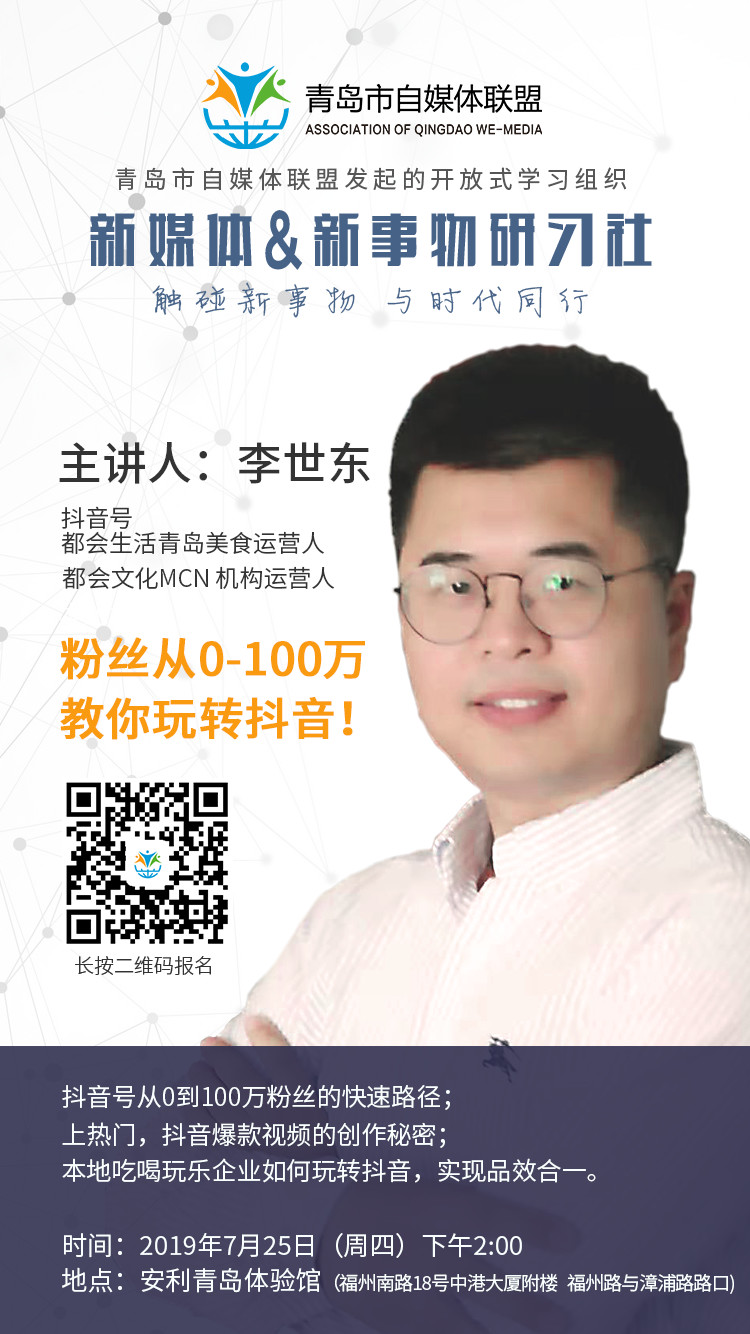為了幫助大家解決運(yùn)營(yíng)抖音過程中遇到的問題,7月25日,由青島市自媒體聯(lián)盟主辦的新媒體&新事物研習(xí)社第十一期,邀請(qǐng)到了抖音號(hào)“都會(huì)生活青島美食”運(yùn)營(yíng)人,都會(huì)文化MCN 機(jī)構(gòu)運(yùn)營(yíng)人李世東,為大家?guī)?lái)“粉絲從0到100萬(wàn)教你玩轉(zhuǎn)抖音”的主題分享。