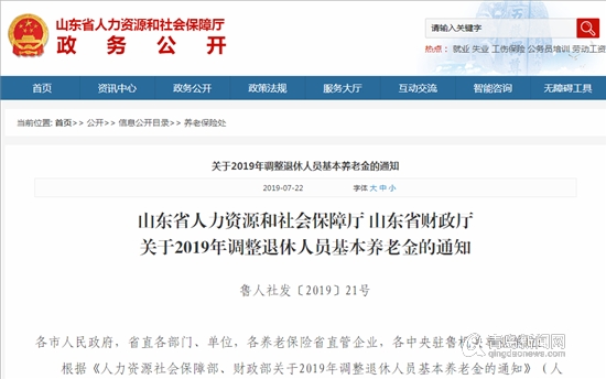 青島新聞網(wǎng)7月22日訊 (記者 張萍)今天,青島新聞網(wǎng)記者從山東省人力資源和社會(huì)保障廳官網(wǎng)獲悉,日前,《關(guān)于2019年調(diào)整退休人員基本養(yǎng)老金的通知》正式印發(fā),確定從2019年1月1日起調(diào)整退休人員基本養(yǎng)老金。這是我省自2005年以來(lái)連續(xù)第15年調(diào)整企業(yè)退休人員養(yǎng)老金,也是繼2016年之后連續(xù)第4年統(tǒng)一安排、同步調(diào)整企業(yè)和機(jī)關(guān)事業(yè)單位退休人員待遇。