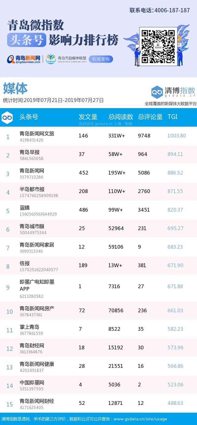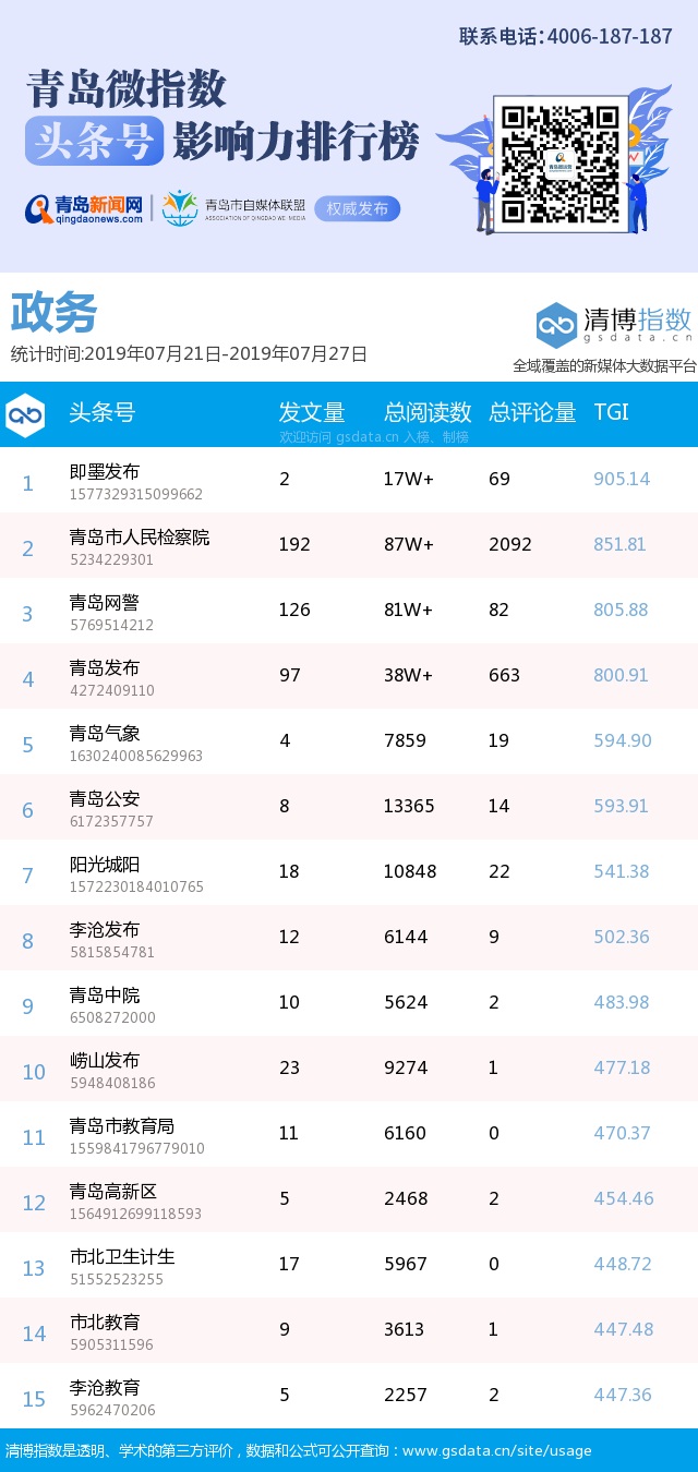 青島新聞網(wǎng)7月29日訊(記者 邢書玲)由青島新聞網(wǎng)、清博指數(shù)平臺聯(lián)手打造的“青島微指數(shù)頭條號影響力排行榜”今日發(fā)布一周(7月21日-7月27日)榜單。