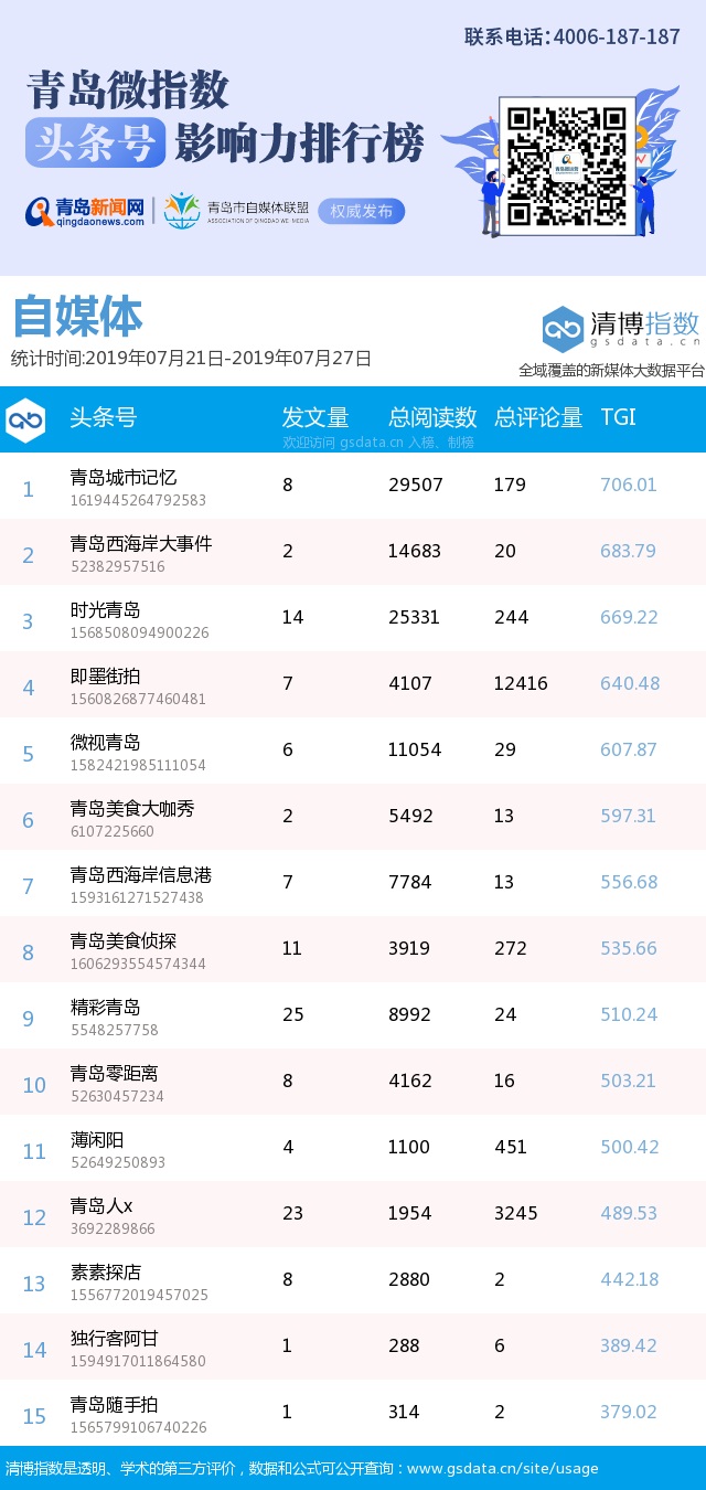 自媒體類頭條號影響力排行榜中,“青澀島嶼”發(fā)布的“青島金沙灘啤酒城正式開城!,現(xiàn)場上萬名游客蜂擁而入”以播放量1.5萬+,評論106的成績占據(jù)榜首。