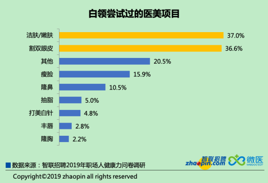 在有過醫(yī)美/整形經(jīng)歷的人中,白領(lǐng)們最主要嘗試的項(xiàng)目為美膚,占比37%,其次為割雙眼皮,有36.6%的白領(lǐng)選擇了此項(xiàng)。與其他項(xiàng)目相比,潔膚/嫩膚和割雙眼皮的風(fēng)險(xiǎn)較低,對(duì)外貌的改變明顯,因此對(duì)白領(lǐng)的吸引力較強(qiáng)。