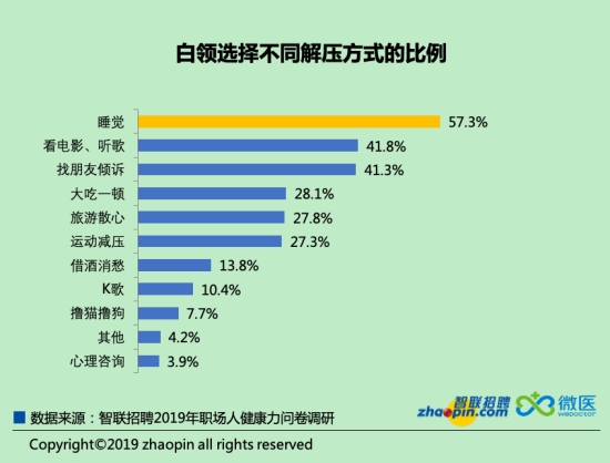 雖然大部分職場人都有釋放壓力的需求,但可選擇的方式有限。數(shù)據(jù)顯示,近六成職場人選擇睡覺來釋放壓力,其次是看電影、聽歌等娛樂活動(dòng)。對(duì)于長期缺覺、空閑時(shí)間少的白領(lǐng)來說,睡到自然醒已經(jīng)十分奢侈了,但這對(duì)改善“腦力勞動(dòng)者”的心態(tài)并無太大幫助。