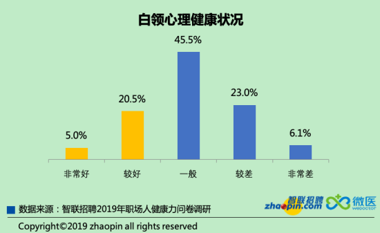 對(duì)于職場人普遍比較關(guān)注的心理健康問題,目前認(rèn)為心理健康狀況一般的占比最多,為45.5%。還有近三成人認(rèn)為心理狀態(tài)不理想?!靶膽B(tài)好”的白領(lǐng)僅占四分之一。