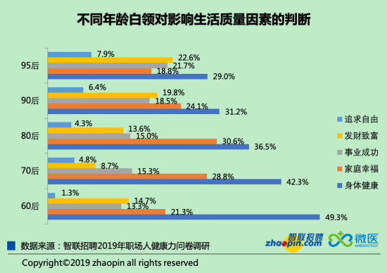 分年齡段看,越年輕越在意財(cái)富,越年長越注重健康。年輕時(shí)趁著身體底子好,呵護(hù)健康的意識(shí)沒那么強(qiáng)烈,而年長的白領(lǐng)在有了一些物質(zhì)積累后則更看重“革命的本錢”了。這也值得我們深思,追求財(cái)富是否一定要以健康為代價(jià)呢?