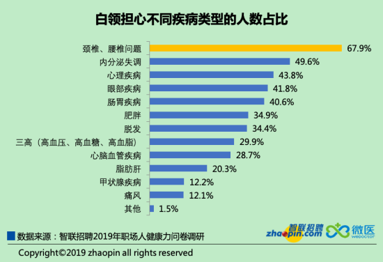 值得注意的是,心理疾病也得到更多白領(lǐng)的重視,排在第三位,比眼部疾病和腸胃疾病更加突出,成為諸多白領(lǐng)防范的健康威脅,好的心態(tài)也成為生活質(zhì)量的大前提。