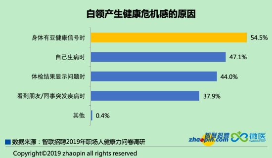 出于對(duì)健康的關(guān)注,54.5%的白領(lǐng)在身體有亞健康信號(hào)時(shí)會(huì)產(chǎn)生健康危機(jī)感。