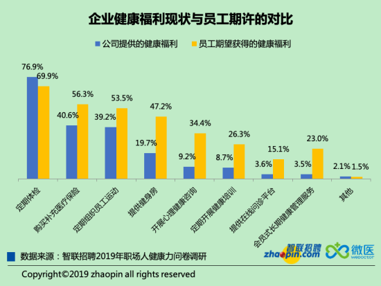 在員工期望獲得的健康福利和企業(yè)已經(jīng)提供的健康福利之間,落差較大的包括提供健身房、提供在線問診平臺(tái)、“會(huì)員式長期健康管理服務(wù)”等。