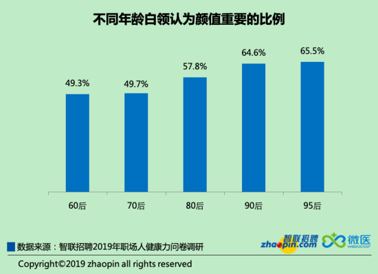 在醫(yī)療事業(yè)可以改善顏值的當(dāng)下,醫(yī)療美容話題在職場中很難規(guī)避,本次調(diào)研中61.3%的白領(lǐng)認(rèn)為顏值就是生產(chǎn)力,這是一個(gè)殘酷的“顏值即正義”的時(shí)代。從年齡來看,越年輕越看重顏值,90后認(rèn)為顏值重要的更多,反之,年齡越長越認(rèn)為有趣的靈魂更重要。