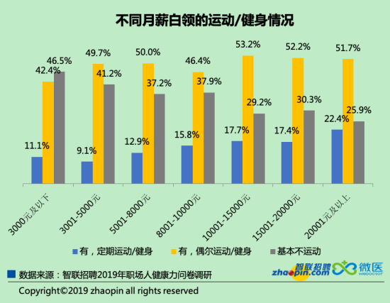 從性別來看,保持運(yùn)動(dòng)習(xí)慣的男性職場人比例遠(yuǎn)高于女性。從薪資水平來看,越是高收入者,對(duì)自我的健康關(guān)注度越高,運(yùn)動(dòng)的比例也更高。月薪在2萬以上的高收入人群堅(jiān)持定期運(yùn)動(dòng)健身的比例達(dá)到了22.4%。而月薪在3000以下的人群中,卻有一半的人基本不運(yùn)動(dòng)。