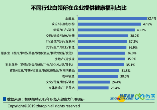 各類行業(yè)中,金融業(yè)職員健康福利最好,52.4%的金融從業(yè)者表示公司有較好的健康福利政策,相較而言,文體教育、傳媒行業(yè)的企業(yè)對(duì)員工的健康關(guān)懷較少。