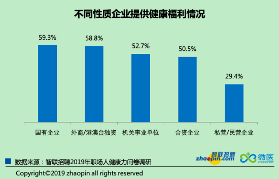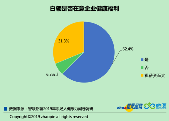 在目前白領(lǐng)的工作狀態(tài)普遍高壓且疲勞,健康也不再是白領(lǐng)個(gè)人的追求和期許,企業(yè)也需承擔(dān)起部分責(zé)任,為員工提供更人性化的工作環(huán)境和更多健康方面的關(guān)懷。調(diào)查數(shù)據(jù)顯示,有62.4%的白領(lǐng)在求職時(shí)非??粗毓镜慕】蹈@?。與此形成鮮明對(duì)比的是,僅有三成多的公司提供了健康福利,私營企業(yè)對(duì)在職員工健康的關(guān)懷度上遠(yuǎn)遠(yuǎn)低于外企和國企。