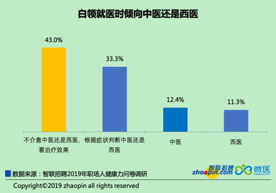 一般而言,西醫(yī)擅長以科學(xué)方式治療疾病,中醫(yī)更偏向于保健和預(yù)防疾病,兩者都有自己的優(yōu)勢。白領(lǐng)們的選擇說明在治療方式上,他們也較為理性,并未受到網(wǎng)絡(luò)上的爭論影響。