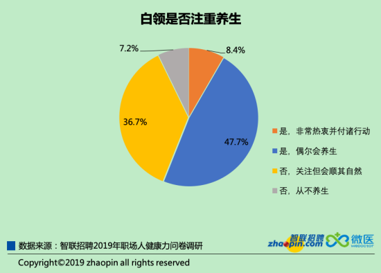 除了運(yùn)動(dòng),日常養(yǎng)生也是保健、預(yù)防疾病的一種途徑。數(shù)據(jù)顯示,56.1%的白領(lǐng)注重養(yǎng)生,其中8.4%白領(lǐng)表示非常熱衷于養(yǎng)生?!氨乇锱蓁坭健?,最初這被視為油膩中年人的標(biāo)配,時(shí)下儼然成為年輕職場人的日常保健方式。