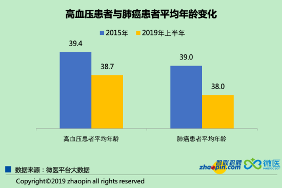 其次,濕疹、甲狀腺結(jié)節(jié)等疾病排名逐漸上升,患病人數(shù)也在增加。值得注意的是,肺結(jié)節(jié)、肺癌、高血壓等疾病已經(jīng)悄悄爬上了2019年上半年高發(fā)病前五的榜單,且患者數(shù)量增加明顯。除了患病數(shù)量增加,這類疾病還呈現(xiàn)年輕化趨勢,患者的平均年齡在逐漸下降,從2015年到2019年上半年,兩類疾病患者的平均年齡分別減少了0.73歲和0.92歲。