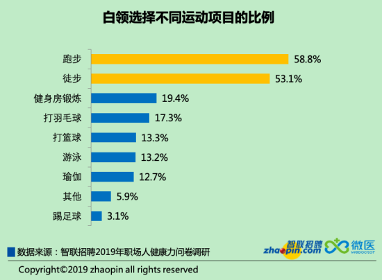 白領(lǐng)們最主要的運(yùn)動(dòng)/健身項(xiàng)目為跑步和徒步,由于這兩項(xiàng)運(yùn)動(dòng)對(duì)場地、裝備等要求不高,屬于經(jīng)濟(jì)適用型運(yùn)動(dòng),更容易堅(jiān)持并達(dá)到運(yùn)動(dòng)的效果,對(duì)于缺乏時(shí)間的白領(lǐng)一族而言很適合。