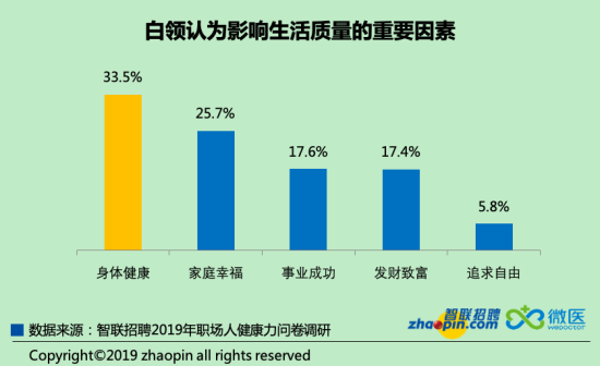 隨時(shí)把生活質(zhì)量掛在嘴邊的白領(lǐng)們,認(rèn)為“身體健康”排在首位的受訪者占比33.5%,在各個(gè)因素中比例最高。
