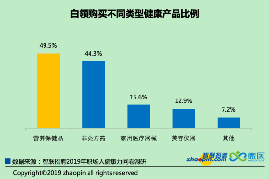 在白領(lǐng)的健康消費(fèi)支出類型上,營養(yǎng)保健品是大頭,占據(jù)了白領(lǐng)購買健康產(chǎn)品的一半。其次是購買“非處方藥”用來應(yīng)對(duì)一些日常的小狀況。