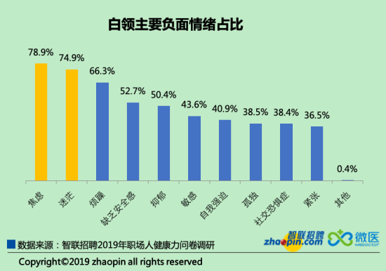 針對(duì)影響心態(tài)的因素得出的調(diào)研數(shù)據(jù)顯示,78.9%的白領(lǐng)認(rèn)為自己存在焦慮現(xiàn)象、74.9%的白領(lǐng)感到迷茫,焦慮和迷茫已經(jīng)深深的刻入了白領(lǐng)的生活字典。