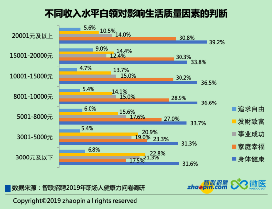 從不同的收入人群來看,月薪兩萬以上的白領(lǐng)選擇“身體健康最決定生活質(zhì)量”的比例高于其他月薪水平群體。月薪三千以下的白領(lǐng)則更偏向于追求財(cái)富,22.8%的人選擇了此項(xiàng),高于其他薪酬人士的比例。