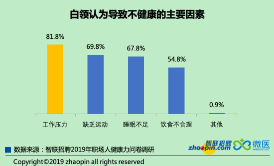 身體健康的鍋依然由“工作”來背,81.8%的職場人認(rèn)為工作壓力是導(dǎo)致不健康的主要因素。其次是缺乏運(yùn)動(dòng)、睡眠不足等生活層面的因素,但這也與現(xiàn)在的高強(qiáng)度工作不無關(guān)系?!督】抵袊袆?dòng)(2019—2030年)》文件中也提到,政府提倡各單位應(yīng)該采取綜合措施降低工作中的壓力。