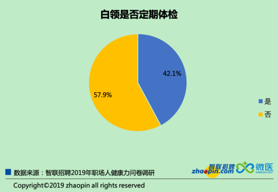 定期體檢是監(jiān)測健康狀況的唯一手段,但這一行為卻未能普及。數(shù)據(jù)顯示,僅42.1%的職場人會(huì)定期體檢。在定期體檢的人中,7成由公司組織,因此,公司若將體檢作為一項(xiàng)福利,對(duì)全社會(huì)的健康水平會(huì)有很大的促進(jìn)作用。