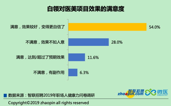 當(dāng)被問及是否滿意醫(yī)療美容項(xiàng)目的效果時(shí),過半白領(lǐng)表示醫(yī)療美容效果好,使自己變得更加自信。白領(lǐng)依靠醫(yī)美項(xiàng)目提升顏值,獲得自信,也側(cè)面反映出顏值正在成為一種競爭力。