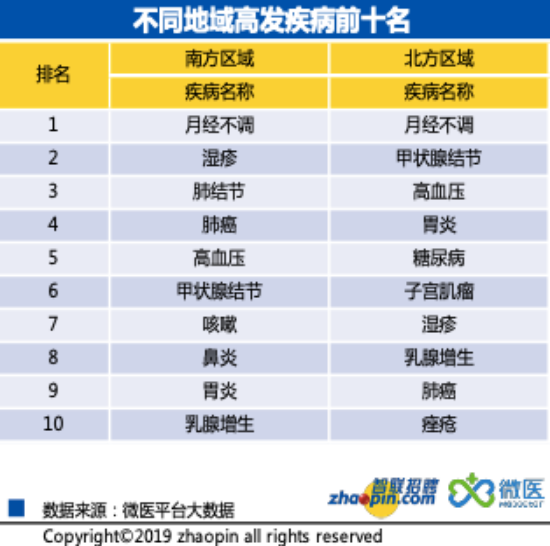從地域來看,由于南北方有著不同的氣候、地理環(huán)境、文化和飲食習(xí)慣等,導(dǎo)致南北方高發(fā)病也存在不少差異。其中南方的濕疹、肺結(jié)節(jié)、肺癌等疾病多發(fā);北方則甲狀腺結(jié)節(jié)、糖尿病等比較多發(fā)。