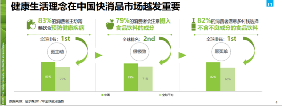 “收入水平的提升成為了驅(qū)使人們追逐品質(zhì)生活的根源”。《報告》顯示,在消費理念上,健康生活的理念在中國快消飲料市場倍受推崇。與全球消費者相比,83%的中國消費者會主動調(diào)整飲食以預(yù)防健康疾病,高出全球平均13個百分點,他們對健康食品和飲料也更為重視,更有消費意愿。尼爾森數(shù)據(jù)顯示,79%的消費者會注意攝入食品和飲料的成分,82%的消費者愿意多付錢選擇安全成分的食品和飲料,而全球平均值僅為68%。